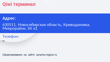 Qiwi, терминал по адресу 630511, Новосибирская область, Криводановка, Микрорайон, 34 к1 в дальнейшем Организация, размещена в следующих категориях: