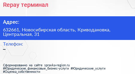 Repay, терминал по адресу 632661, Новосибирская область, Криводановка, Центральная, 31 в дальнейшем Организация, размещена в следующих категориях: