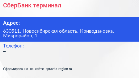 СберБанк, терминал по адресу 630511, Новосибирская область, Криводановка, Микрорайон, 1 в дальнейшем Организация, размещена в следующих категориях:
