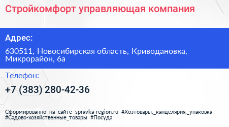 Стройкомфорт, управляющая компания по адресу 630511, Новосибирская область, Криводановка, Микрорайон, 6а в дальнейшем Организация, размещена в следующих категориях: