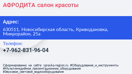 АФРОДИТА, салон красоты по адресу 630511, Новосибирская область, Криводановка, Микрорайон, 25а в дальнейшем Организация, размещена в следующих категориях: