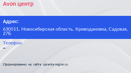 Avon, центр по адресу 630511, Новосибирская область, Криводановка, Садовая, 27Б в дальнейшем Организация, размещена в следующих категориях: