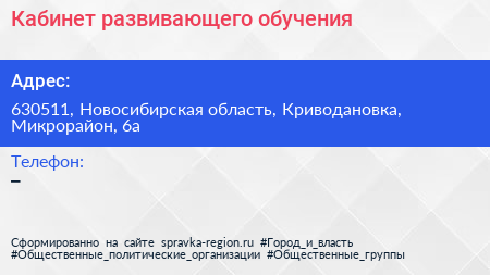 Кабинет развивающего обучения по адресу 630511, Новосибирская область, Криводановка, Микрорайон, 6а в дальнейшем Организация, размещена в следующих категориях: