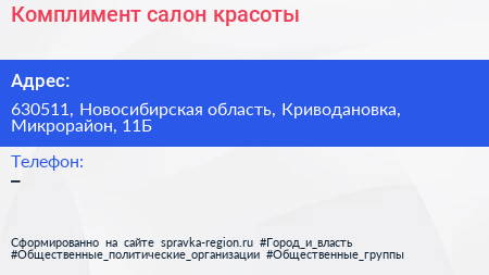 Комплимент, салон красоты по адресу 630511, Новосибирская область, Криводановка, Микрорайон, 11Б в дальнейшем Организация, размещена в следующих категориях:
