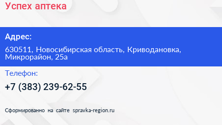 Успех, аптека по адресу 630511, Новосибирская область, Криводановка, Микрорайон, 25а в дальнейшем Организация, размещена в следующих категориях: