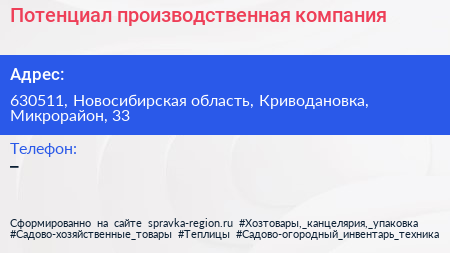 Потенциал, производственная компания по адресу 630511, Новосибирская область, Криводановка, Микрорайон, 33 в дальнейшем Организация, размещена в следующих категориях: