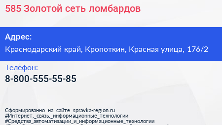 585*Золотой, сеть ломбардов по адресу Краснодарский край, Кропоткин, Красная улица, 176/2 в дальнейшем Организация, размещена в следующих категориях: