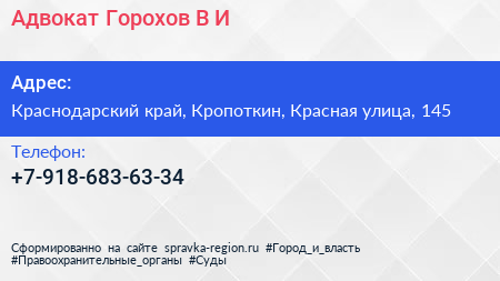Адвокат Горохов В.И. по адресу Краснодарский край, Кропоткин, Красная улица, 145 в дальнейшем Организация, размещена в следующих категориях: