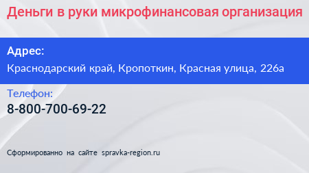 Деньги в руки, микрофинансовая организация по адресу Краснодарский край, Кропоткин, Красная улица, 226а в дальнейшем Организация, размещена в следующих категориях: