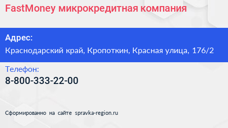 FastMoney, микрокредитная компания по адресу Краснодарский край, Кропоткин, Красная улица, 176/2 в дальнейшем Организация, размещена в следующих категориях: