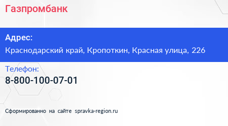 Газпромбанк по адресу Краснодарский край, Кропоткин, Красная улица, 226 в дальнейшем Организация, размещена в следующих категориях: