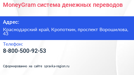 MoneyGram, система денежных переводов по адресу Краснодарский край, Кропоткин, проспект Ворошилова, 43 в дальнейшем Организация, размещена в следующих категориях: