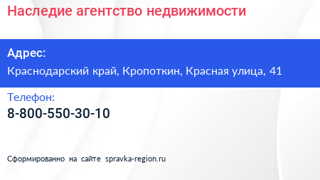 Наследие, агентство недвижимости по адресу Краснодарский край, Кропоткин, Красная улица, 41 в дальнейшем Организация, размещена в следующих категориях: