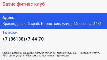 Базис, фитнес-клуб по адресу Краснодарский край, Кропоткин, улица Морозова, 32/2 в дальнейшем Организация, размещена в следующих категориях: