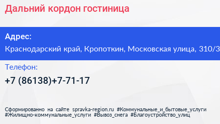 Дальний кордон, гостиница по адресу Краснодарский край, Кропоткин, Московская улица, 310/3 в дальнейшем Организация, размещена в следующих категориях: