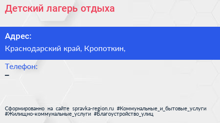 Детский лагерь отдыха по адресу Краснодарский край, Кропоткин, в дальнейшем Организация, размещена в следующих категориях: