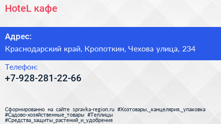 HoteL, кафе по адресу Краснодарский край, Кропоткин, Чехова улица, 234 в дальнейшем Организация, размещена в следующих категориях: