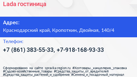 Lada, гостиница по адресу Краснодарский край, Кропоткин, Двойная, 140/4 в дальнейшем Организация, размещена в следующих категориях: