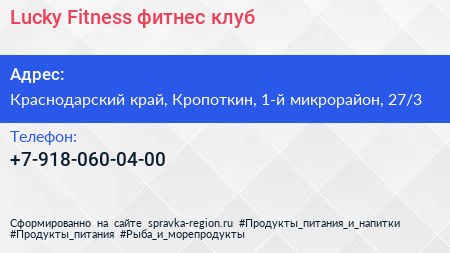 Lucky Fitness, фитнес-клуб по адресу Краснодарский край, Кропоткин, 1-й микрорайон, 27/3 в дальнейшем Организация, размещена в следующих категориях: