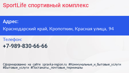 SportLife, спортивный комплекс по адресу Краснодарский край, Кропоткин, Красная улица, 94 в дальнейшем Организация, размещена в следующих категориях: