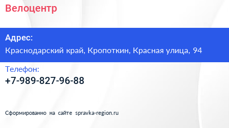 Велоцентр по адресу Краснодарский край, Кропоткин, Красная улица, 94 в дальнейшем Организация, размещена в следующих категориях: