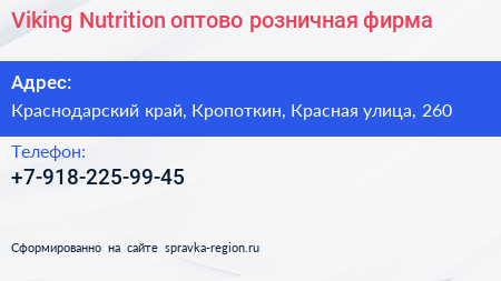 Viking Nutrition, оптово-розничная фирма по адресу Краснодарский край, Кропоткин, Красная улица, 260 в дальнейшем Организация, размещена в следующих категориях:
