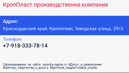 КропПласт, производственна компания по адресу Краснодарский край, Кропоткин, Заводская улица, 29/3 в дальнейшем Организация, размещена в следующих категориях: