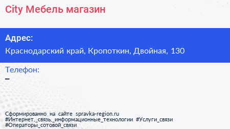 City Мебель, магазин по адресу Краснодарский край, Кропоткин, Двойная, 130 в дальнейшем Организация, размещена в следующих категориях: