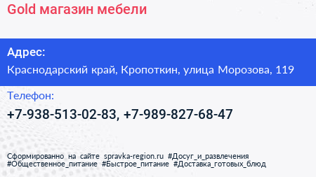 Gold, магазин мебели по адресу Краснодарский край, Кропоткин, улица Морозова, 119 в дальнейшем Организация, размещена в следующих категориях: