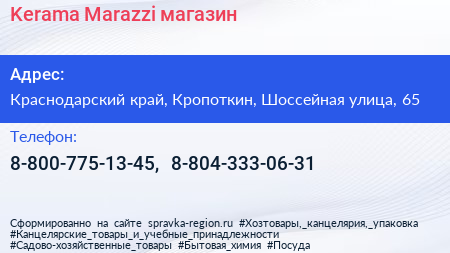 Kerama Marazzi, магазин по адресу Краснодарский край, Кропоткин, Шоссейная улица, 65 в дальнейшем Организация, размещена в следующих категориях: