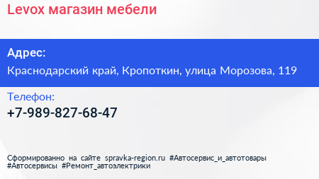 Levox, магазин мебели по адресу Краснодарский край, Кропоткин, улица Морозова, 119 в дальнейшем Организация, размещена в следующих категориях: