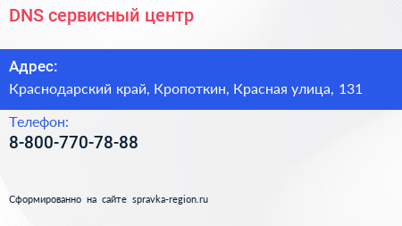 DNS, сервисный центр по адресу Краснодарский край, Кропоткин, Красная улица, 131 в дальнейшем Организация, размещена в следующих категориях: