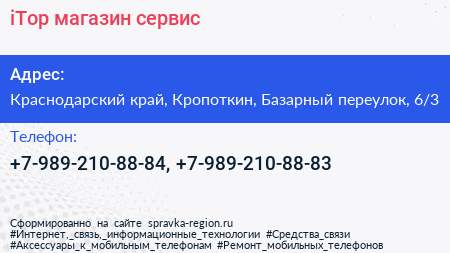 iTop, магазин-сервис по адресу Краснодарский край, Кропоткин, Базарный переулок, 6/3 в дальнейшем Организация, размещена в следующих категориях:
