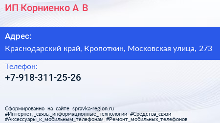 ИП Корниенко А.В. по адресу Краснодарский край, Кропоткин, Московская улица, 273 в дальнейшем Организация, размещена в следующих категориях: