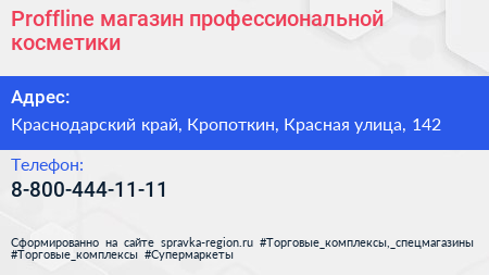 Proffline, магазин профессиональной косметики по адресу Краснодарский край, Кропоткин, Красная улица, 142 в дальнейшем Организация, размещена в следующих категориях: