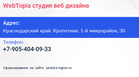 WebTopia, студия веб-дизайна по адресу Краснодарский край, Кропоткин, 1-й микрорайон, 30 в дальнейшем Организация, размещена в следующих категориях: