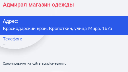 Адмирал, магазин одежды по адресу Краснодарский край, Кропоткин, улица Мира, 167а в дальнейшем Организация, размещена в следующих категориях: