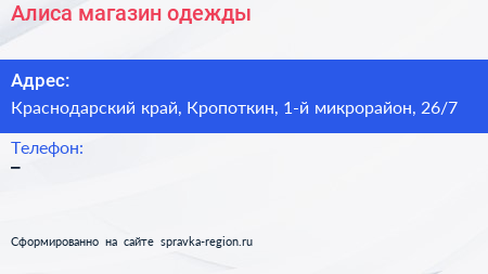 Алиса, магазин одежды по адресу Краснодарский край, Кропоткин, 1-й микрорайон, 26/7 в дальнейшем Организация, размещена в следующих категориях: