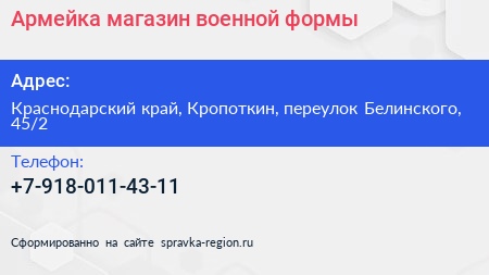 Армейка, магазин военной формы по адресу Краснодарский край, Кропоткин, переулок Белинского, 45/2 в дальнейшем Организация, размещена в следующих категориях: