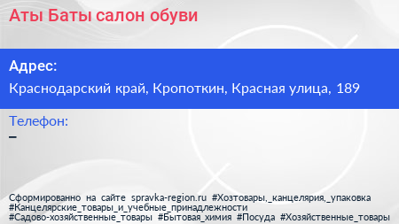 Аты-Баты, салон обуви по адресу Краснодарский край, Кропоткин, Красная улица, 189 в дальнейшем Организация, размещена в следующих категориях: