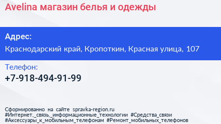 Avelina, магазин белья и одежды по адресу Краснодарский край, Кропоткин, Красная улица, 107 в дальнейшем Организация, размещена в следующих категориях: