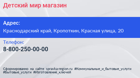 Детский мир, магазин по адресу Краснодарский край, Кропоткин, Красная улица, 20 в дальнейшем Организация, размещена в следующих категориях: