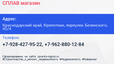 СПЛАВ, магазин по адресу Краснодарский край, Кропоткин, переулок Белинского, 45/4 в дальнейшем Организация, размещена в следующих категориях: