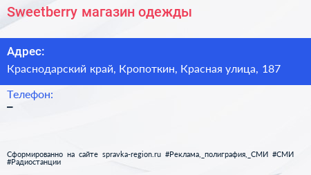 Sweetberry, магазин одежды по адресу Краснодарский край, Кропоткин, Красная улица, 187 в дальнейшем Организация, размещена в следующих категориях: