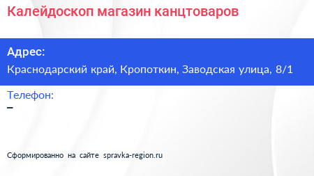 Калейдоскоп, магазин канцтоваров по адресу Краснодарский край, Кропоткин, Заводская улица, 8/1 в дальнейшем Организация, размещена в следующих категориях: