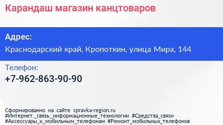 Карандаш, магазин канцтоваров по адресу Краснодарский край, Кропоткин, улица Мира, 144 в дальнейшем Организация, размещена в следующих категориях: