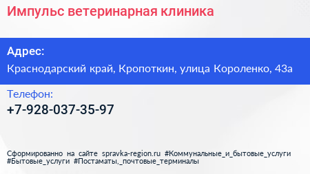 Импульс, ветеринарная клиника по адресу Краснодарский край, Кропоткин, улица Короленко, 43а в дальнейшем Организация, размещена в следующих категориях:
