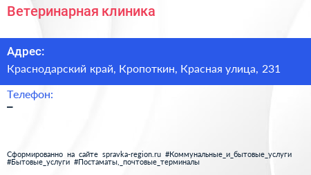 Ветеринарная клиника по адресу Краснодарский край, Кропоткин, Красная улица, 231 в дальнейшем Организация, размещена в следующих категориях: