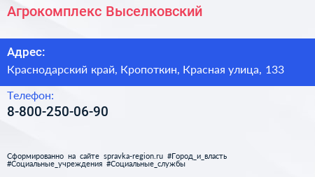 Агрокомплекс Выселковский по адресу Краснодарский край, Кропоткин, Красная улица, 133 в дальнейшем Организация, размещена в следующих категориях: