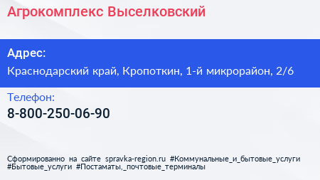 Агрокомплекс Выселковский по адресу Краснодарский край, Кропоткин, 1-й микрорайон, 2/6 в дальнейшем Организация, размещена в следующих категориях: